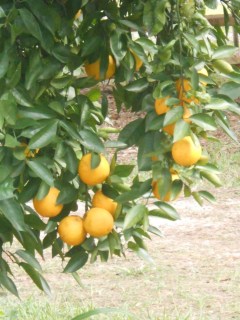 The orange tree is loaded, but not quite ripe yet.
