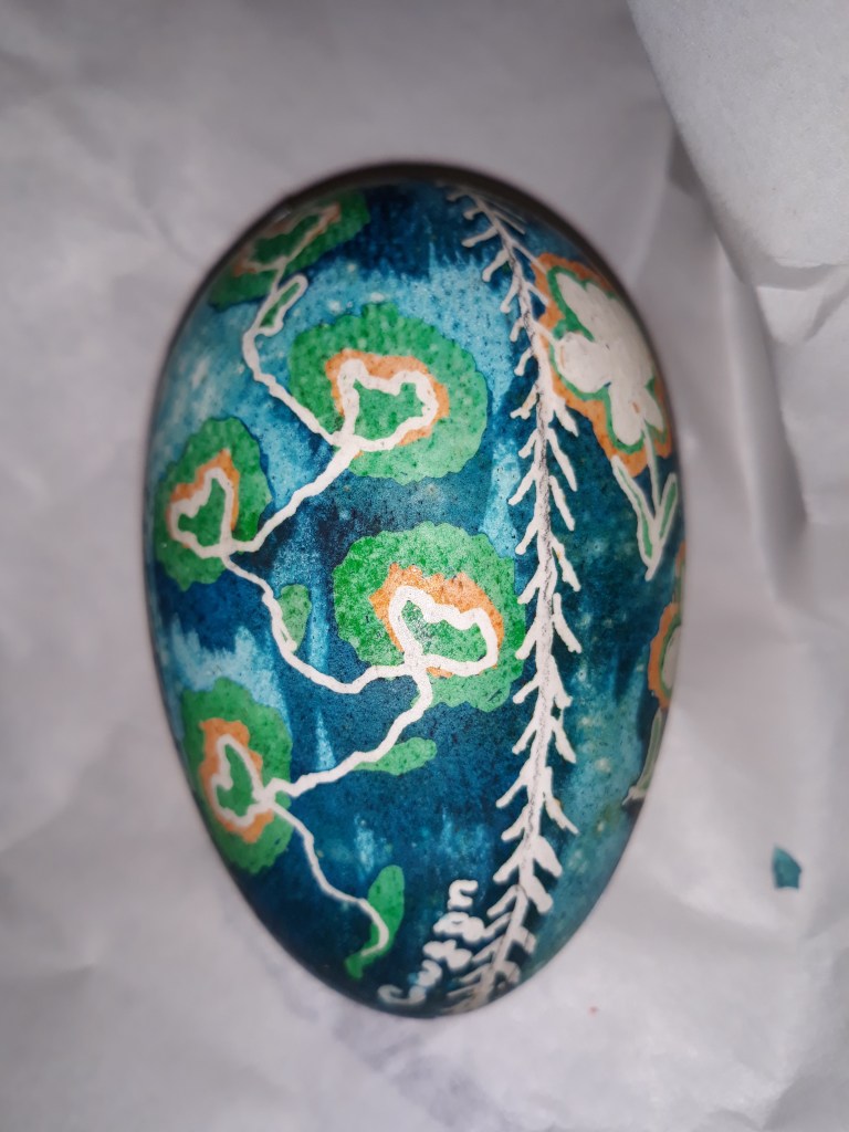 I went to an antique store and found some eggs there. One was broken and not on the stand, Not sure that it ever had been, but I bought it and decided to make a mosaic picture with it. The egg was done in Pysanky and was really nice. The stand will get used with one of my other eggs.