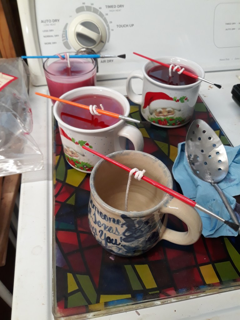 Went out to the shop today and spent most of the morning making candles. I had a bunch of candles that I had burnt down and I remade them into new candles. I have one big candles to melt down and finish a big candles with it and then I am done for awhile. next I want to bring out my paper making supplies and work on that and see if I can make some paper to use in the business for some earring cards and the like. I have lots of paper saved up and have all the things that I need to make it with so I think that I can get a lot done and then that will clear out another spot in the shop.