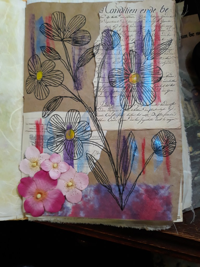 I also did some art work this afternoon and did the first page in my eco flower book I really think that it came out pretty good for my first attempt. I need to find some white coffee filters so that I can make some “snowflakes” that I can color and use in the book.