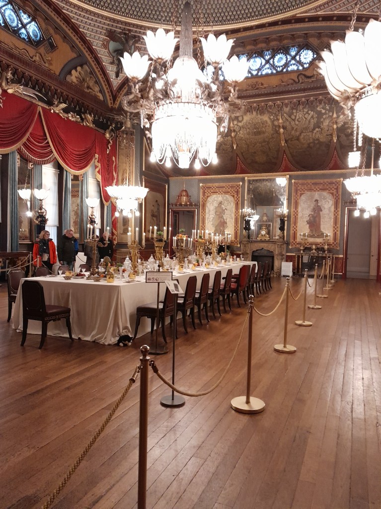 Most of the Royal furnishing are still there and you can walk thru most of the building as it would have been during King George’s reign. The chandeliers in the dining hall are over 700 lbs and are made of steel instead of precious metals. They are very massive and I have wondered if the people eating there might have worried about them falling on their head.