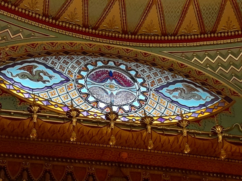 Although built in the Indo-Saracenic style, the inside reflects a beautiful Chinese motief all thought the building. The dragons woven in the carpets as well as the wallpapers depicting Chinese design are very rich and beautiful.