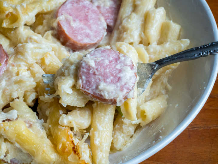 - Pour sauce over pasta, and add the sauerkraut, sausage, green onions, and 2 cups of the cheese. Pour into prepared baking dish and top with remaining cheese.
