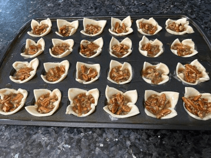 Spoon the pecan filling into each pastry cup, filling most of the way while leaving a little space at the top.